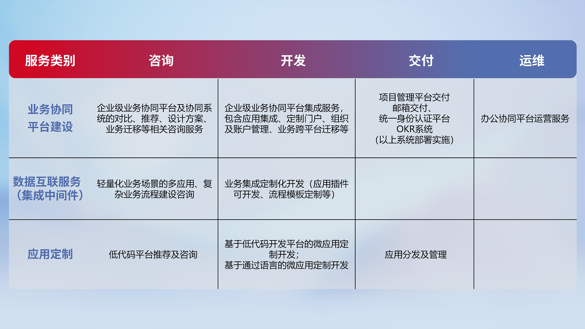 针对钉钉、、、、企微、、IDaas等平台级产品提供产品的规划、、、方案、、、、交付、、定制化开发等服务,,,实现如统一协同办公、、智能客户服务、、、混合会议管理、、、、智能数据查询、、等业务场景,,实现数字化转型。。