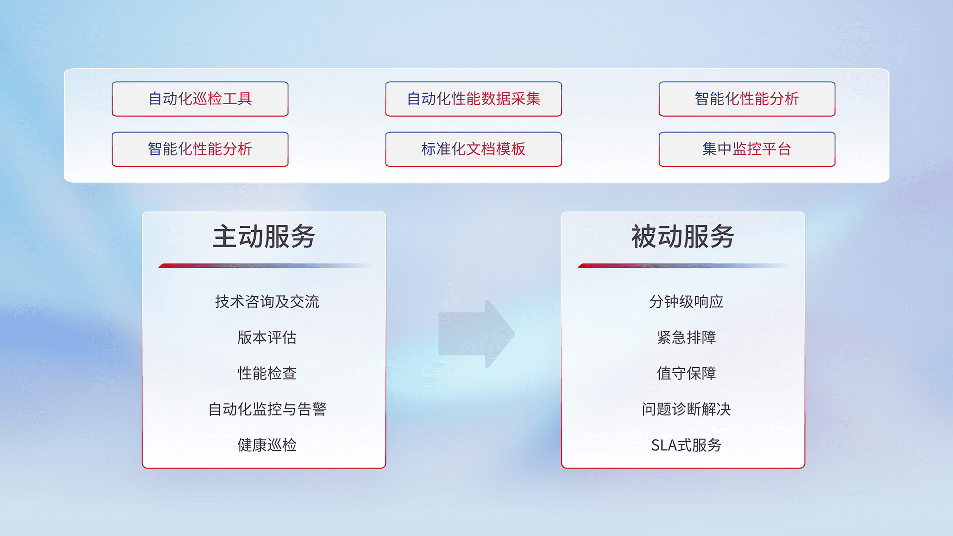 智能化工具和标准化文档,,,,保障服务质量,,,提供主动服务(包含技术咨询、、、版本评估、、、性能检查、、、自动化监控与告警、、、健康巡检)和被动服务包含(分钟级响应、、、紧急排障、、、值守保障、、、问题诊断解决、、、、SLA服务)。。。。